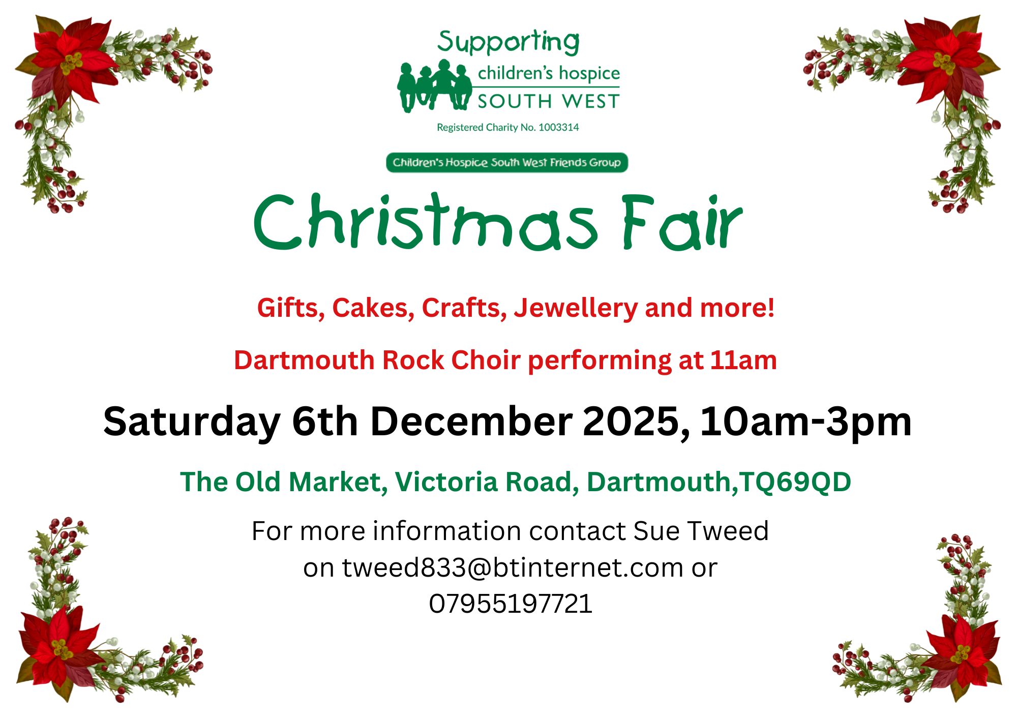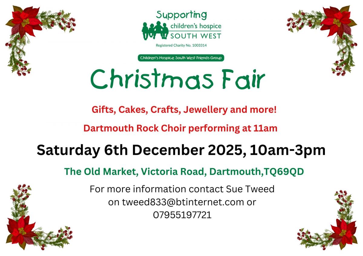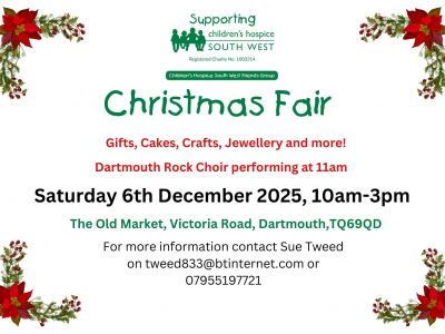 Join us in The Old Market in Dartmouth from 10am to 3pm on Saturday 6th December for a Christmas Fair in aid of Children’s Hospice South West. Lots of stalls selling all sorts of desirables, including gifts, crafts,cakes, jewellery and more. Plus Dartmouth Rock Choir will be performng at 11am.